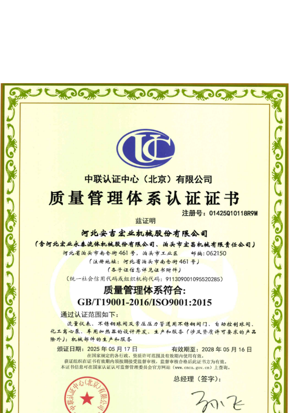 河北宏業(yè)永泰流體機械股份有限公司(原泊頭儀表總廠),生產(chǎn)流量儀表產(chǎn)品有三十多年的歷史。參加了節(jié)流裝置國家標準GB/T2624-1981的起草工作。公司占地12萬平方米,注冊資金3500萬元。主要產(chǎn)品有節(jié)流裝置、儀器儀表、各類不銹鋼閥門、各種化工離心泵。公司取得了ISO9001:2015質(zhì)量體系認證、挪威船級社CE認證、出口產(chǎn)品Emark認證、特種設備制造許可證等。同時河北宏業(yè)永泰還是中石化物資供應商網(wǎng)絡成員,取得了中石油、中海油物資供應商準入證,是中國神華集團、華電集團、大唐集團、中廣核等公司合格供應商。產(chǎn)品出口日本、阿爾及利亞等國家。